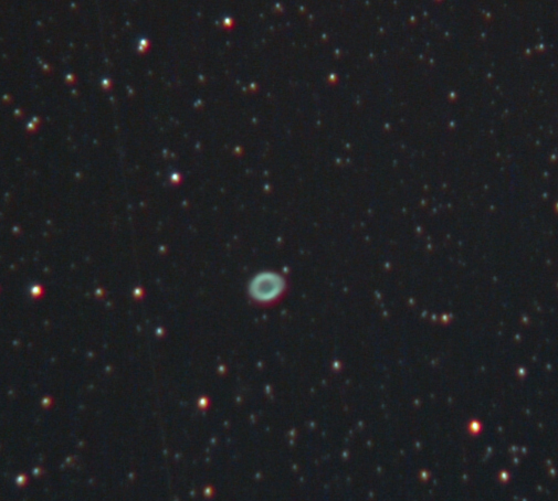 | M57, 21.04.2020 mit Xiaomi Mi8, (Takahashi FS 60, 374mm Brennweite, Flattner, APM Lunt 13mm 100 Grad Okular), 132 DNG_Dateien a 35 sek und ISO 800, 77 min gesamte Belichtungszeit